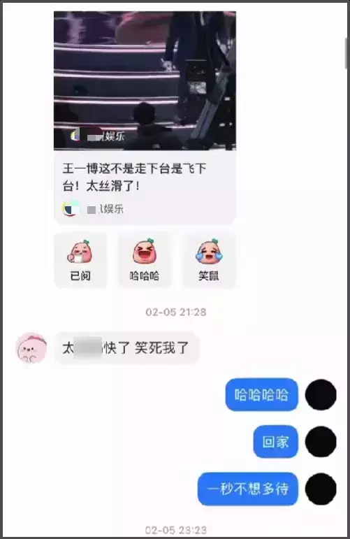 对方还分享过王一博微博之夜领完奖,飞速下台的视频,号主也说自己着急回家,一秒都不想多待。