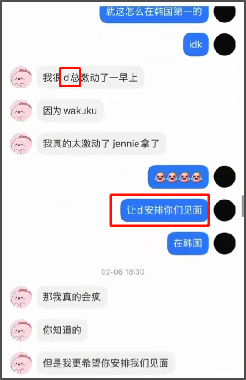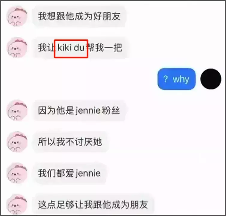聊天记录里的女方喜欢韩星Jennie,綦美合也喜欢Jennie。女方在聊天的时候说想见她,号主就说让“d总”带你去。后面又说,可以直接跟jn(Jennie)说是他女朋友,如果不信就拿合照证明。